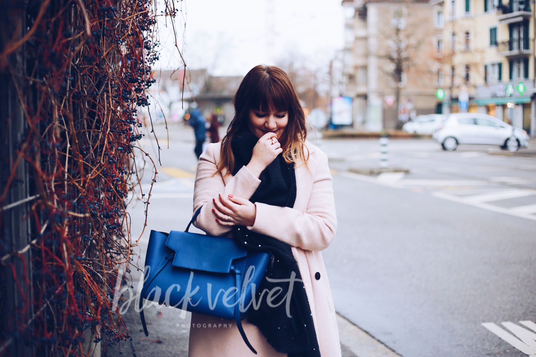 Outfit Rosa Mantel Rosa Kuschel Pullover Und Dunkelblaue Tasche