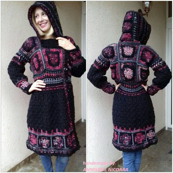 Häkeln Winter Mantelwolle Hoodedcoatschwarz Grau Und Rosa Etsy