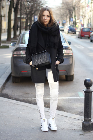 Wie Weiße Niedrige Sneakers Mit Schwarzen Mantels Zu Kombinieren 30