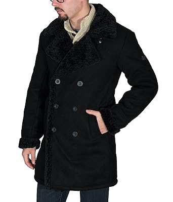 Langer Zweireihiger Mantel Aus Lammfellimitat Schwarze Jeans