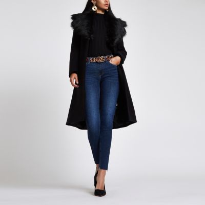 Schwarzer Wollmantel Mit Kunstfell Und Gürtel Mäntel Mäntel