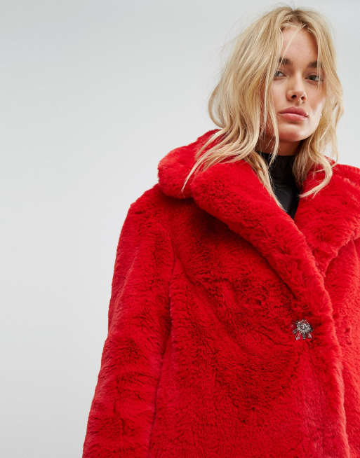 Coat Mango Red Faux Fur Longline Coat Myntra